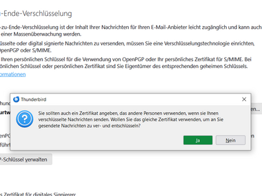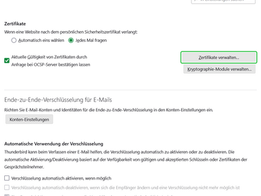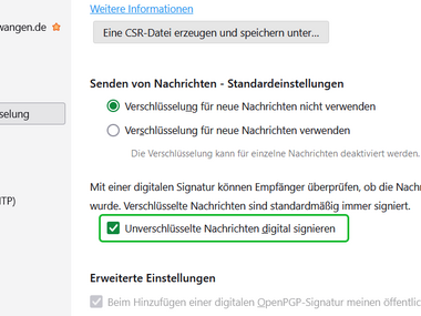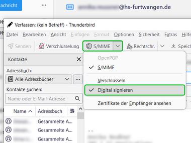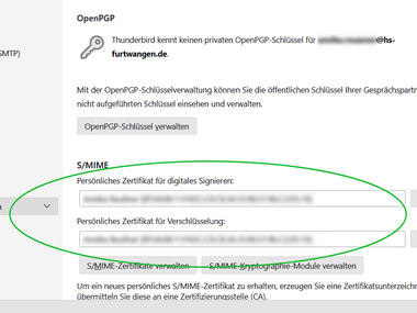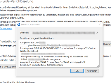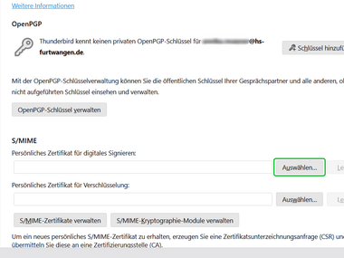 The DFN user certificate (see helpcard Internal link opens in the same window:Applying for user certificate for email and HIP (MYCERT 10-010)) (only for HFU employees) can be imported and set up as a digital signature in Mozilla Thunderbird. The digital signature verifies your identity in email communication and ensures that your emails are delivered to the recipient unchanged.