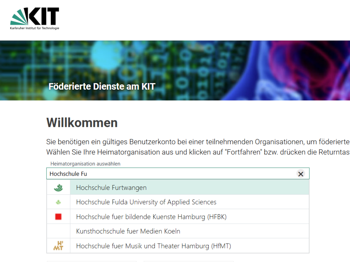 Wählen Sie unter „Heimatorganisation“ die Hochschule Furtwangen aus und klicken auf „Fortfahren“.