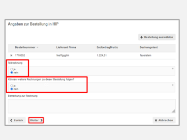 Fenster "Angaben zur Bestellung in HIP" mit den Fragen zur Teilrechnung und ob weitere Rechnungen dieser Bestellung folgen können.