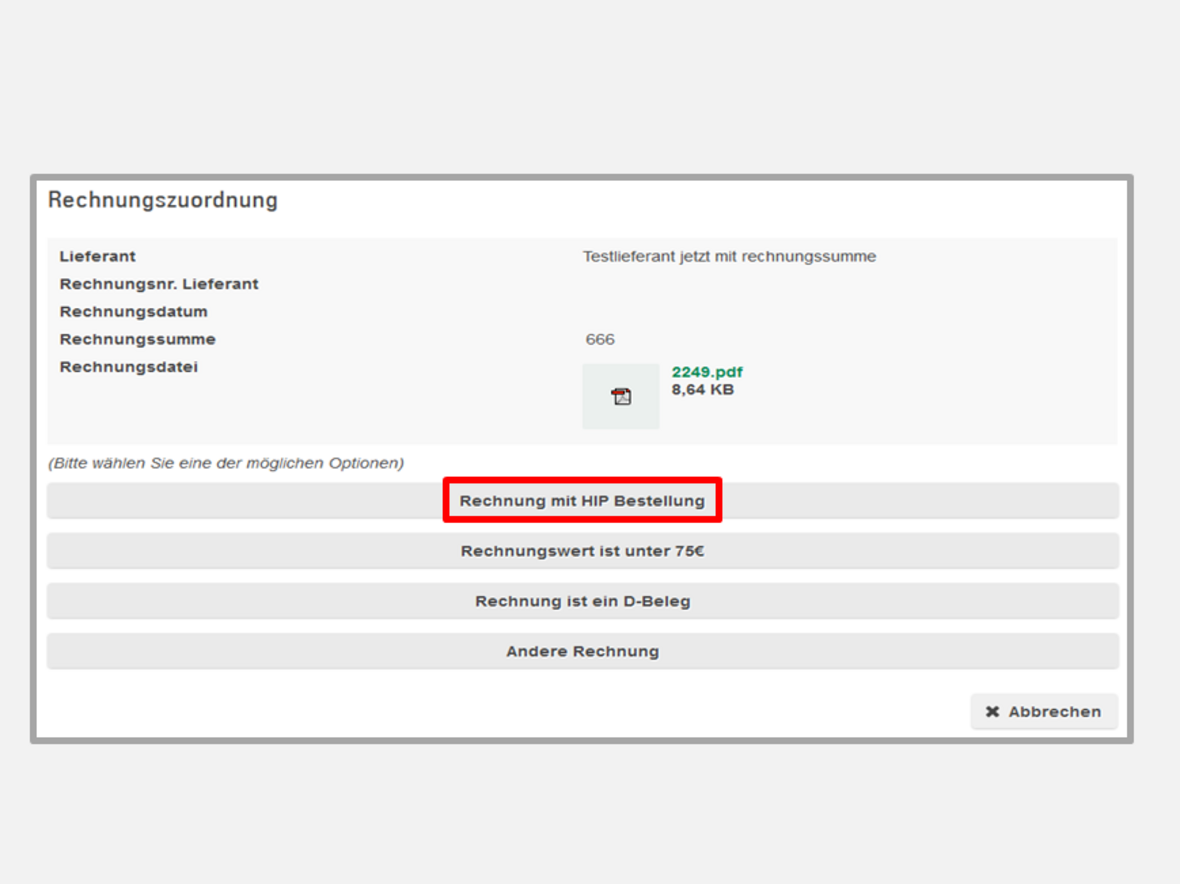 Fenster "Rechnungszuordnung" mit den Optionen "Rechnung mit HIP Bestellung", "Rechnungswert ist unter 75 €", "Rechnung ist ein D-Beleg" und "Andere Rechnung".