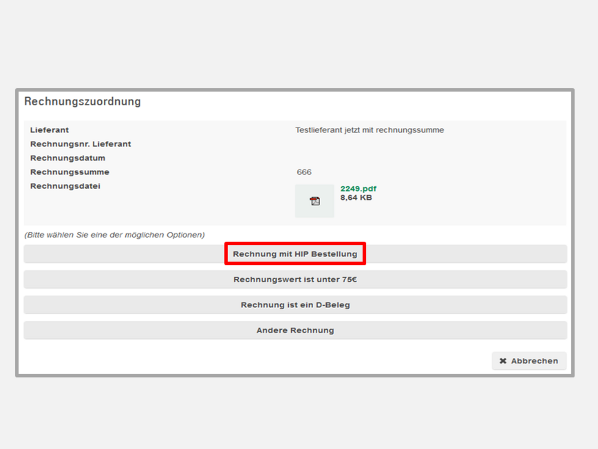 Wählen Sie die Option "Rechnung mit HIP Bestellung", wenn zu der spezifischen Rechnung eine HIP Bestellung vorliegt.
