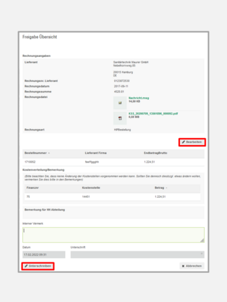 Klicken Sie auf "Bearbeiten", um mit der inhaltlichen Freigabe der Rechnung fortzufahren.