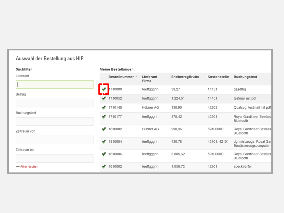 Fenster "Auswahl der Bestellung aus HIP", um mit Klick auf den grünen Haken die zur Rechnung passende Bestellung auszuwählen. Außerdem die Möglichkeit, nach Bestellungen zu filtern.