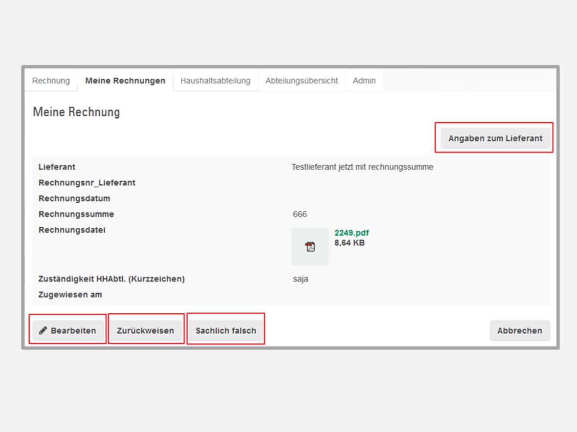 Fenster "Meine Rechnung" mit den Optionen "Bearbeiten", "Zurückweisen", "Sachlich falsch" und "Angaben zum Lieferant".