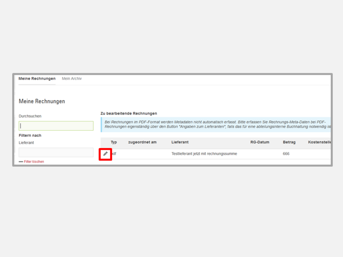 Fenster "Meine Rechnungen" mit dem Stiftsymbol zum Bearbeiten einer Rechnung.