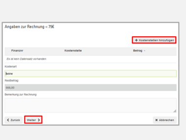 Fenster "Angaben zur Rechnung < 75 €". Bei dieser Rechnungsform müssen Sie die Kostenstelle manuell eintragen.