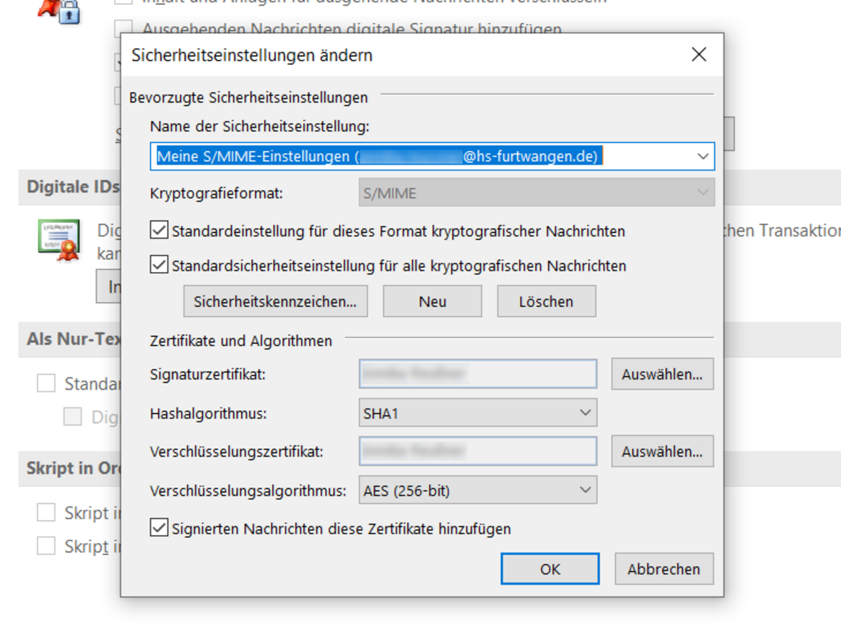 Wählen Sie unter Signaturzertifikat und Verschlüsselungszertifikat ihr neues Zertifikat aus und setzen Sie dann die weiteren Einstellungen wie folgt bevor Sie die Zertifikatseinstellung mit "OK" bestätigen.